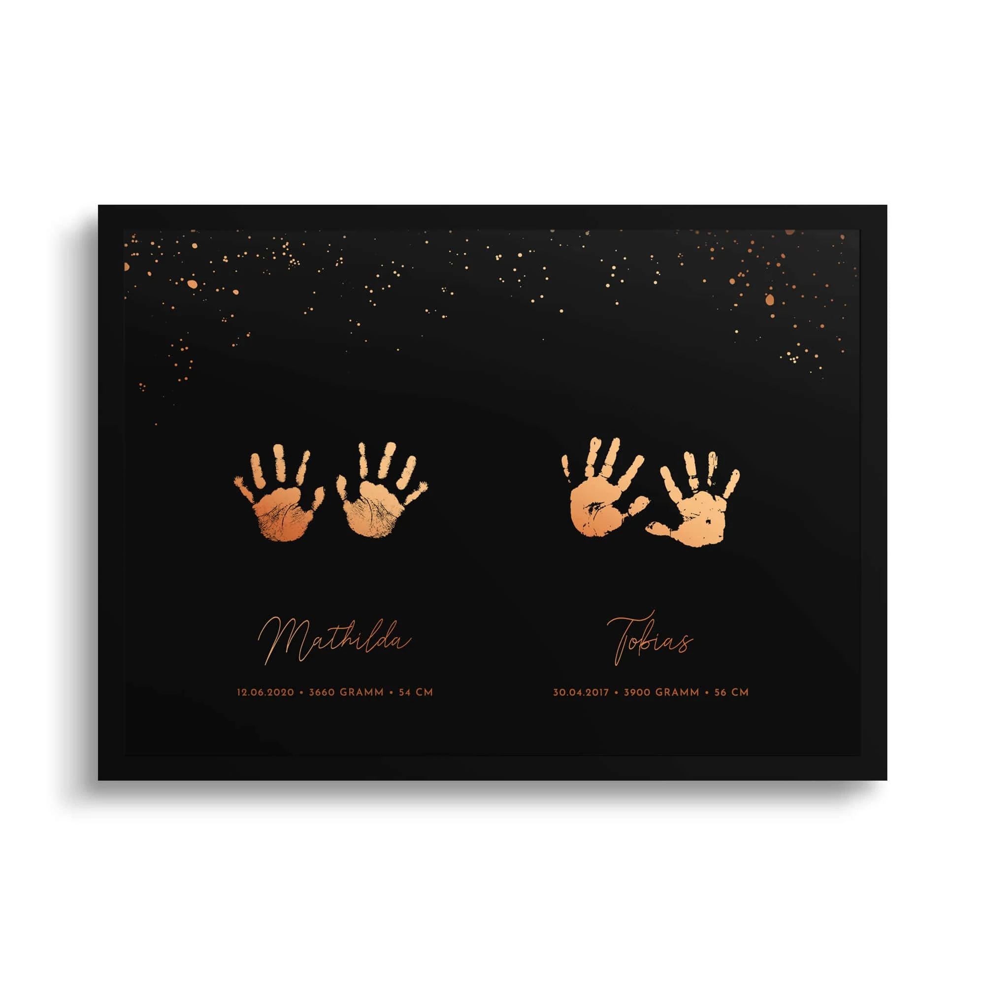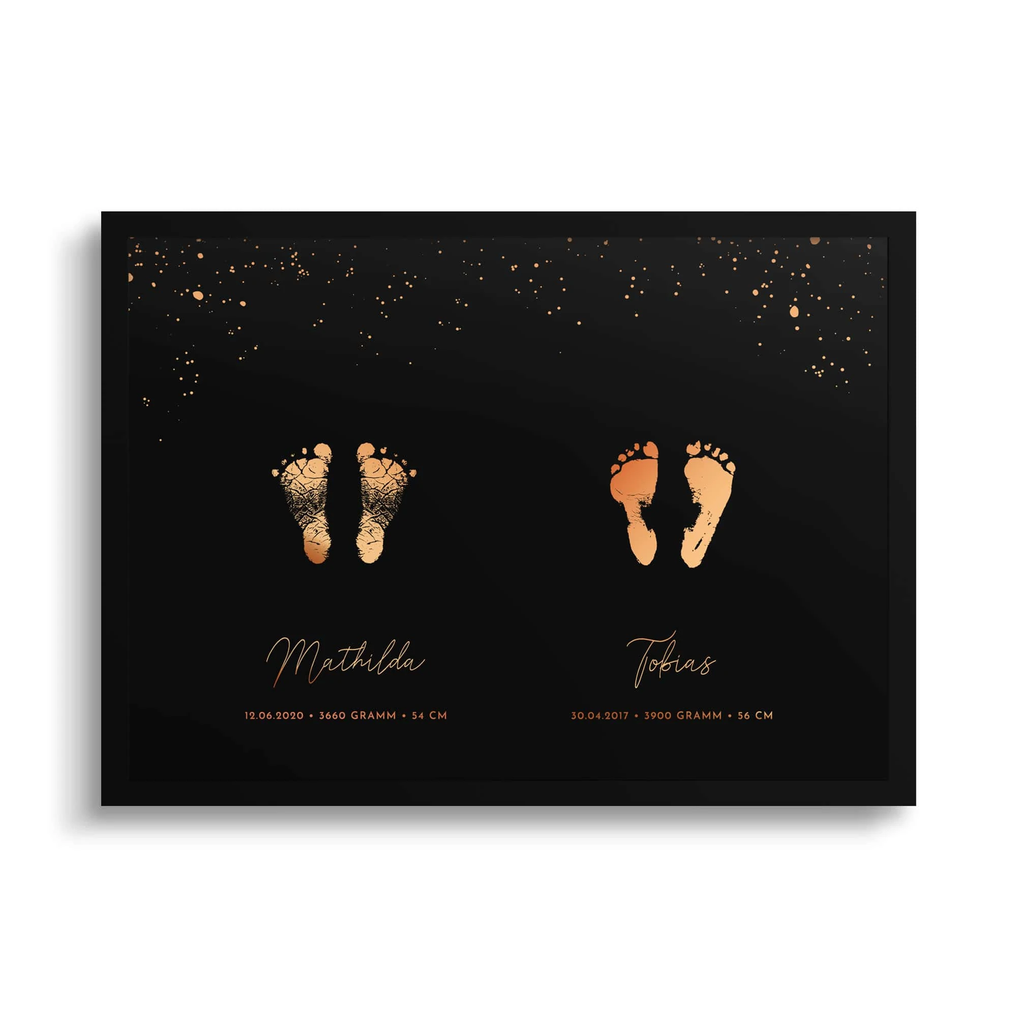 Nach Erhalt des Fuß- oder Handabdruck wird das Poster von einem unserer Grafiker individuell nach Wunsch gesetzt und wahlweise durch eine elegante Druck-Veredelung in Gold, Silber, Roségold oder Kupfer hervorgehoben – ein absoluter Hingucker und ein haptisches Erlebnis der Extraklasse.